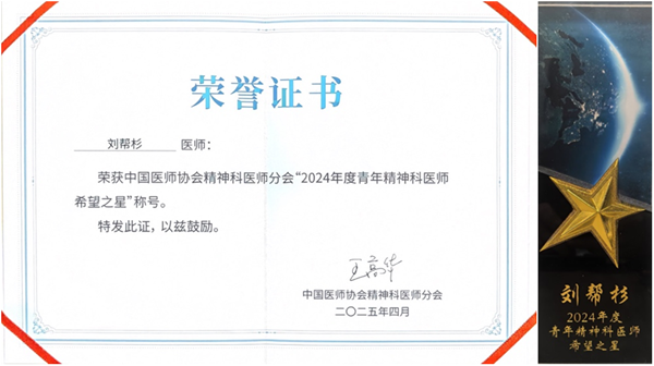 我院刘帮杉医生荣获中国医师协会精神科医师分会“2024年度青年精神科医师希望之星”称号