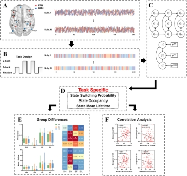 研究结果显示,在执行认知任务期间,大脑网络存在多个功能状态,包括以高额顶叶网络活动性以及低默认网络活动性为特征的认知需求状态(根据活动性的变化幅度可分为高认知需求状态和低认知需求状态),以及低额顶叶网络活动性和高默认模式网络活动性的静息状态。各个功能状态在短时间内持续动态切换以应对认知任务的实际需要。精神分裂症患者的这种动态切换出现了异常,他们更难切换进入并维持在高认知需求状态。而健康同胞虽然也较难进入并维持在高认知需求状态,但他们会通过增加低认知需求状态的比例来进行代偿,以维持相对正常的工作记忆表现。