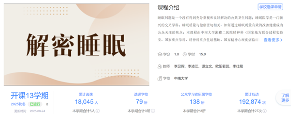 自上线以来,《解密睡眠》课程的影响力不断扩大,已成为国内睡眠健康教育领域的重要品牌。截至目前,课程在智慧树平台累计开课13期,吸引全国1.8万余名学习者选课,覆盖华中师范大学、北京体育大学、广西民族大学等79所高校。不仅如此,课程凭借专业的内容与实用的价值,还吸引了大量临床医务人员与社会公众参与学习,成为医务人员更新睡眠医学知识、公众了解睡眠健康的重要渠道。李卫晖教授表示:“我们希望通过这种开放共享的方式,真正把优质教育资源转化为社会健康红利。”