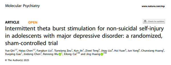 近日,中南大学湘雅二医院精神病学科黄兢副研究员、崔夕龙主治医师团队在精神病学领域权威期刊Molecular Psychiatry(中科院一区TOP,IF=10.1)在线发表了题为“Intermittent theta burst stimulation for non-suicidal self-injury in adolescents with major depressive disorder: a randomized, sham-controlled trial”的研究论文。