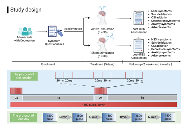 研究采用随机、双盲、伪刺激对照设计,共纳入60名12-18岁伴有NSSI行为的青少年抑郁障碍患者,随机分为真刺激组和伪刺激组,接受了连续5天、每天5次、每次1800脉冲募铀傺映TBS治疗。主要结局指标为干预结束后4周末青少年修订版蓄意自伤量表(Deliberate Self-Harm Inventory-Adolescent Revised, DSHI-AR)量表评分的变化。次要结局指标包括青少年修订版蓄意自伤意念量表(DSHI-AR ideation)、渥太华自伤量表成瘾子量表(OSI-addiction)、汉密尔顿抑郁量表17项(HAM-D₁₇)、汉密尔顿焦虑量表(HAMA)、贝克自杀意念量表(BSI)、匹兹堡睡眠质量指数(PSQI)及Barratt冲动量表11项(BIS-11)评分的变化。